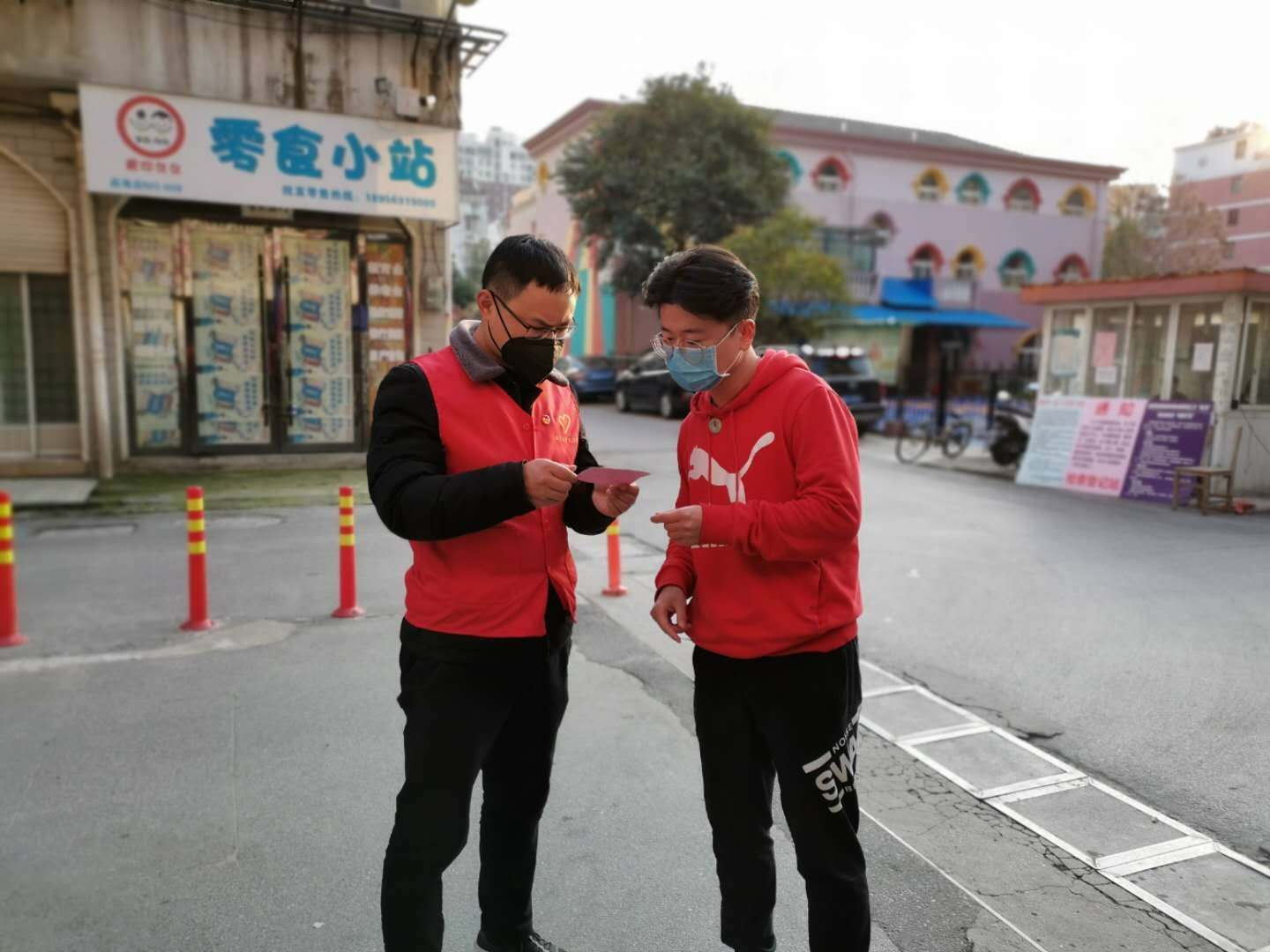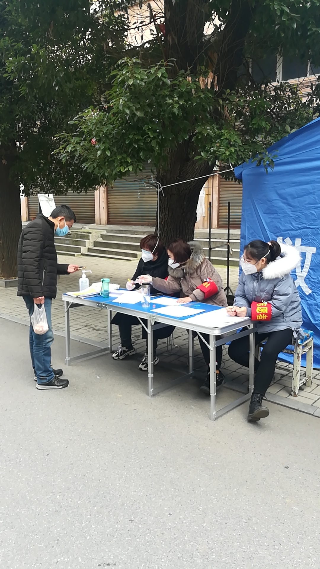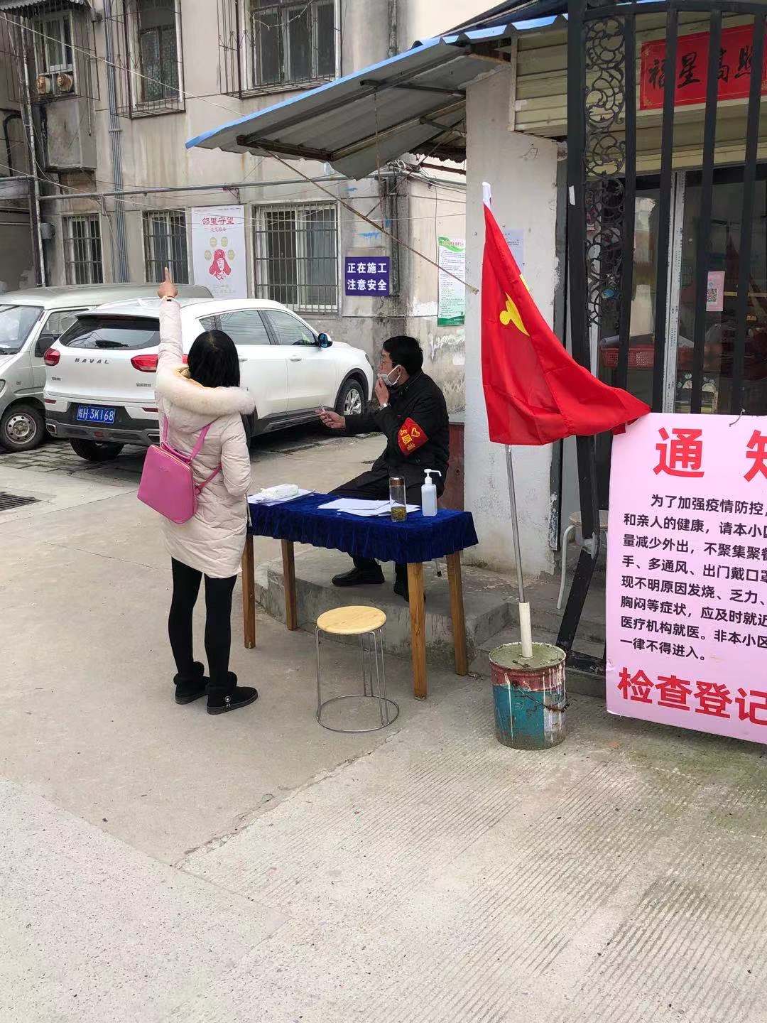 下沉社區(qū)的公司員工們給居民發(fā)出入證做登記,宣傳疫情知識(shí),量體溫等